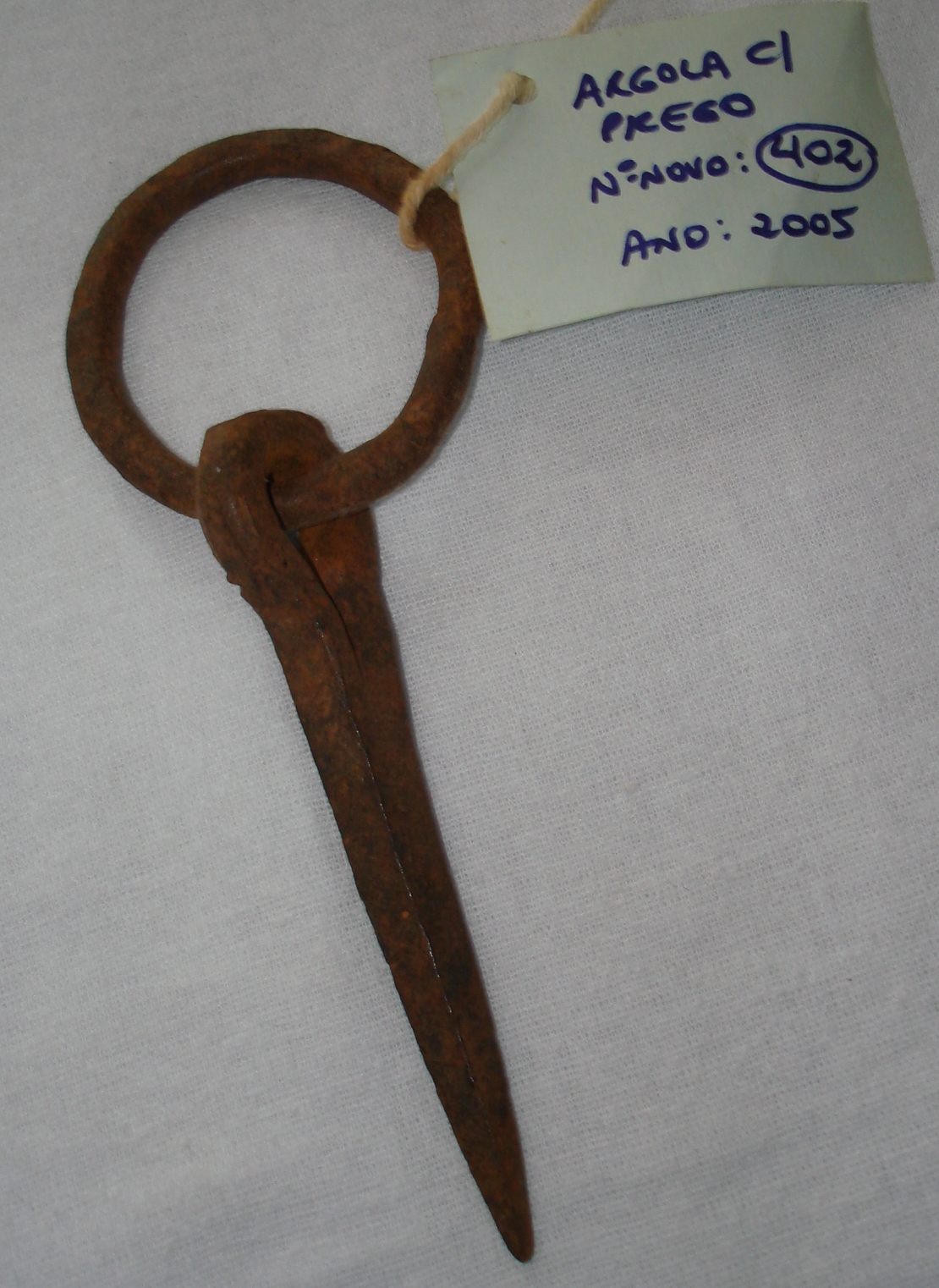 Argola (com prego)administrador4 de junho de 2025Serro (MG) Documento 402_A-1-1-1-4 Baixar MetadadosTÃtuloArgola (com prego)AutorNão identificadoNº anteriorNão encontradoDenominaçãoArgola (com prego)Materialferro | metalTécnicafundiçãoOrigemMinas Geraisdata de produçãoSéc. XIXProcedênciaSerro (MG)Classificação04 Construção > 04.4 Fragmento de ConstruçãoResumo descritivoArgola confeccionada em ferro batido, com corpo em cÃrculo delgado e estrutura em ponta que se prende por pequeno aro para encaixe em estrutura de madeira.Anexos