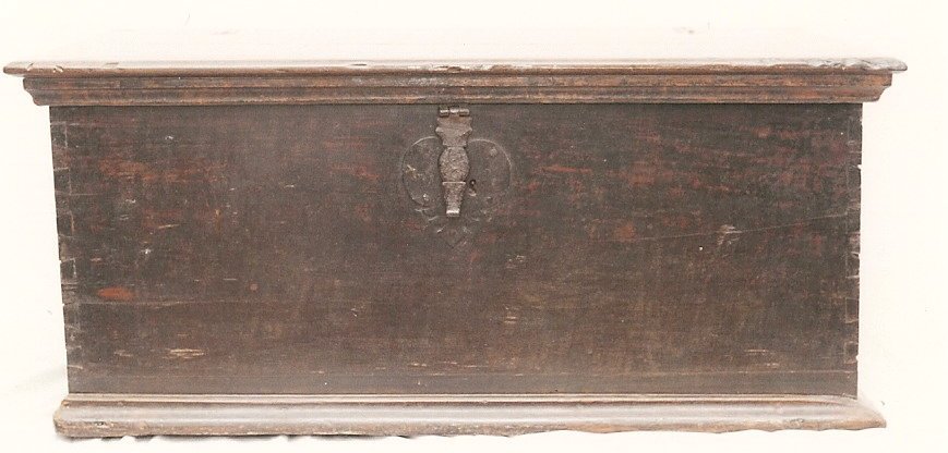 Baú confeccionado em madeira (jacarandá), de manufatura rústica, com ferragens em metal (ferro batido). Objeto composto por caixa retangular, com tampo saliente, emoldurado e abaulado, confeccionado em duas tábuas e fixado através de duas dobradiças ornadas por volutas na extremidade e presas por três parafusos. Encaixes laterais do tipo macho-fêmea. Fechadura longilínea, com terminação em voluta, em ferro batido, presa à peça por dobradiça. Espelho de fechadura em formato de "copas" invertida, com quatro ornatos em ponta, dispostos dois de cada lado, e preso à estrutura por cinco parafusos interna com duas ripas de madeira para sustentação do tampo. À esquerda do objeto, na parte interna, escaninho composto por caixa retangular com tampo para colocação de pequenos objetos. Parte inferior externa emoldurada e parte posterior reta.