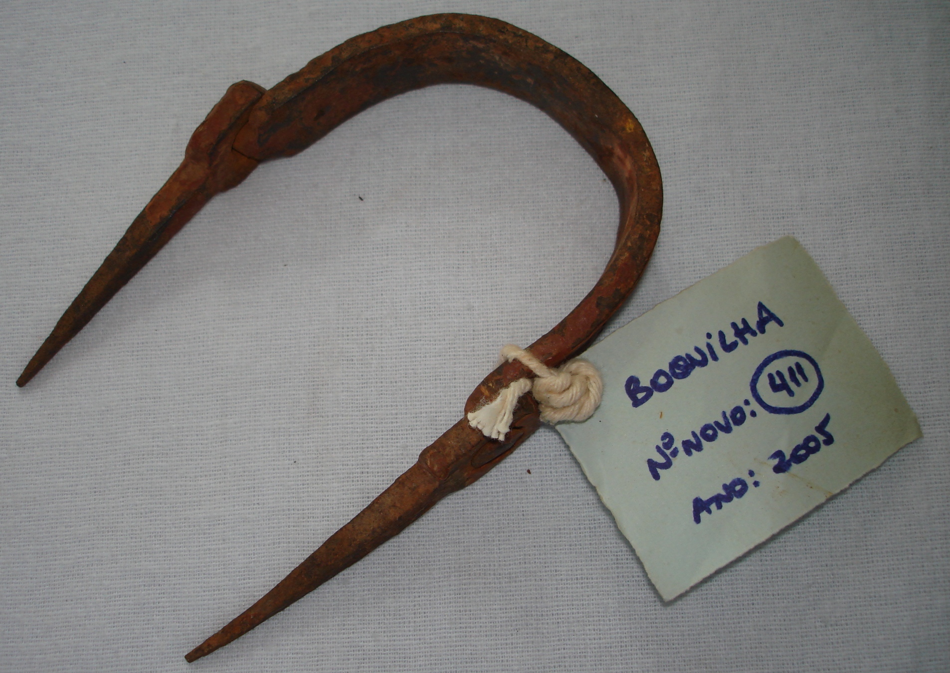 Boquilha confeccionada em metal (ferro) com estrutura superior em semi-cÃrculo arrematada por dois lingotes do mesmo metal, tendo estes a extremidade superior quadrada e vazada e a extremidade inferior em ponta para encaixe no caixilho da janela ou da porta. Eixo de movimentação do objeto feito por prolongamento retorcido da estrutura principal terminada em quadrado.