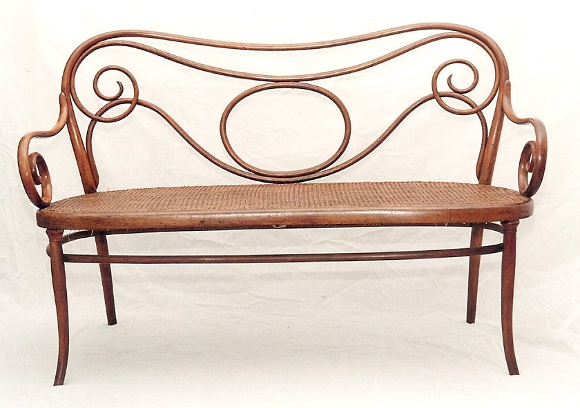 Canapé, , confeccionado em madeira clara (faia), com parte frontal do assento levemente abaulado e assento braços em madeira vergada com terminação em volutas, encosto com hastes em curva, tendo medalhão vazado na parte central e motivos decorativos hastes do encosto se prolongam para a composição das pernas traseiras. Amarração em formato ovalado que une e reforça as pernas, além de haste abaulada para sustentação do móvel posicionada na parte central do assento. Pernas dianteiras levemente curvas à frente com a parte superior encaixada e com ornamentação das partes através de parafusos.