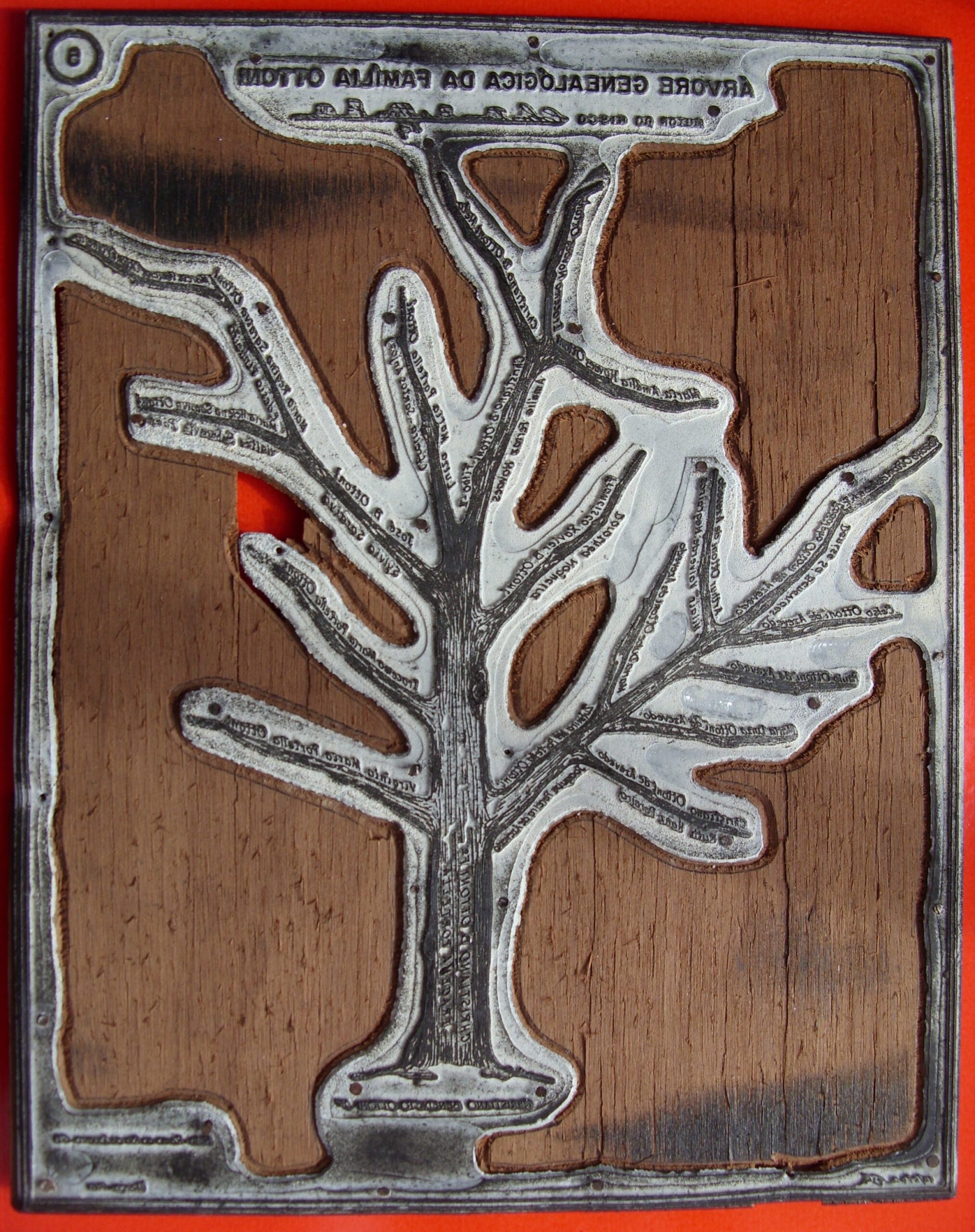 Clichê para impressão em prelo manual, confeccionado em metal (zinco?) sobre suporte em madeira, com ilustração em baixo-relevo, representando a prancha nº 5 do livro sobre a árvore genealógica da Família Ottoni (Christiano Benedicto Ottoni Filho - ramo do Rio de Janeiro). A placa em metal encontra-se fixada a uma tábua delgada de madeira através de pequenos pregos.