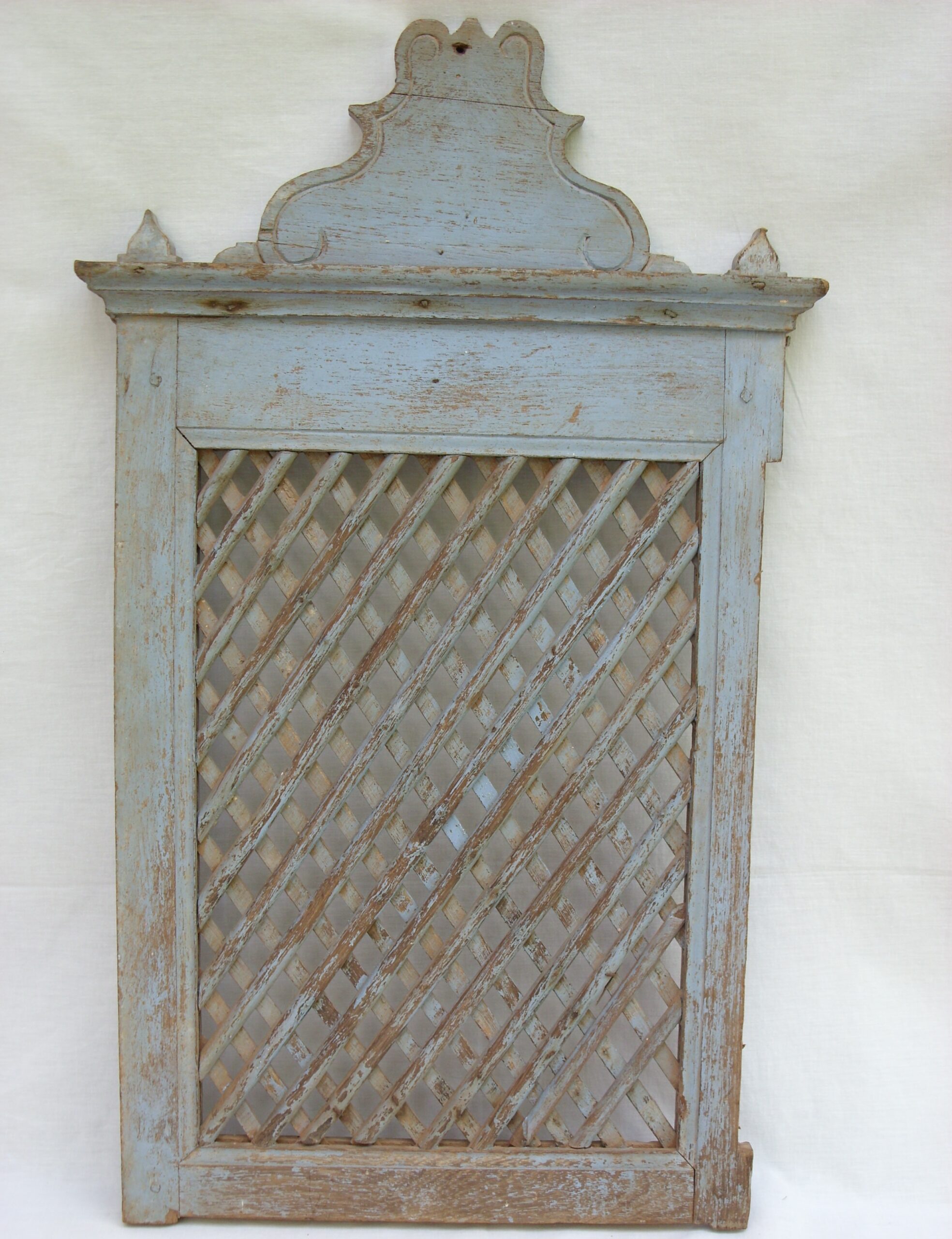 Tela [de confessionário] confeccionada em madeira recortada e pintada em tom azul claro. Estrutura do objeto em formato retangular verticalizado, tendo a parte superior com campo liso emoldurado por friso e recortes em curvas, contracurvas e volutas, além de duas terminações laterais cimalha reta com friso central frisada e composta por hastes cruzadas, formando espécie de muxarabiê.