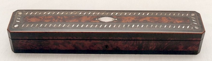 Estojo de leque, de formato retangular, com vértices recortados, confeccionado em madeira e revestido por tartaruga, tendo trabalho em marchetaria com madrepérola. Ao centro da tampa, escudo ovalado ladeado por dois pequenos cÃrculos, cercado por moldura retangular ornada por filetes posicionados em diagonal entremeados por motivos fitomorfos estilizados. Nas extremidades do ornato marchetado, quatro emblemas quadrangulares com vértice abaulado e volutas, tendo detalhe ovalado ao centro. Na parte frontal da peça, fechadura na parte interna por tecido acetinado, em tom pérola, cercado por cordão torsado no mesmo tom. Na tampa, a seguinte inscrição, pintada em tinta azul e vermelha sobre o tecido: "BARBARA B OTTONI", com ornato estilizado, e "30 de NOVEMBRO de 1887". Tampa fixada à estrutura por dobradiça longilÃnea dourada presa por parafusos. Fundo liso.