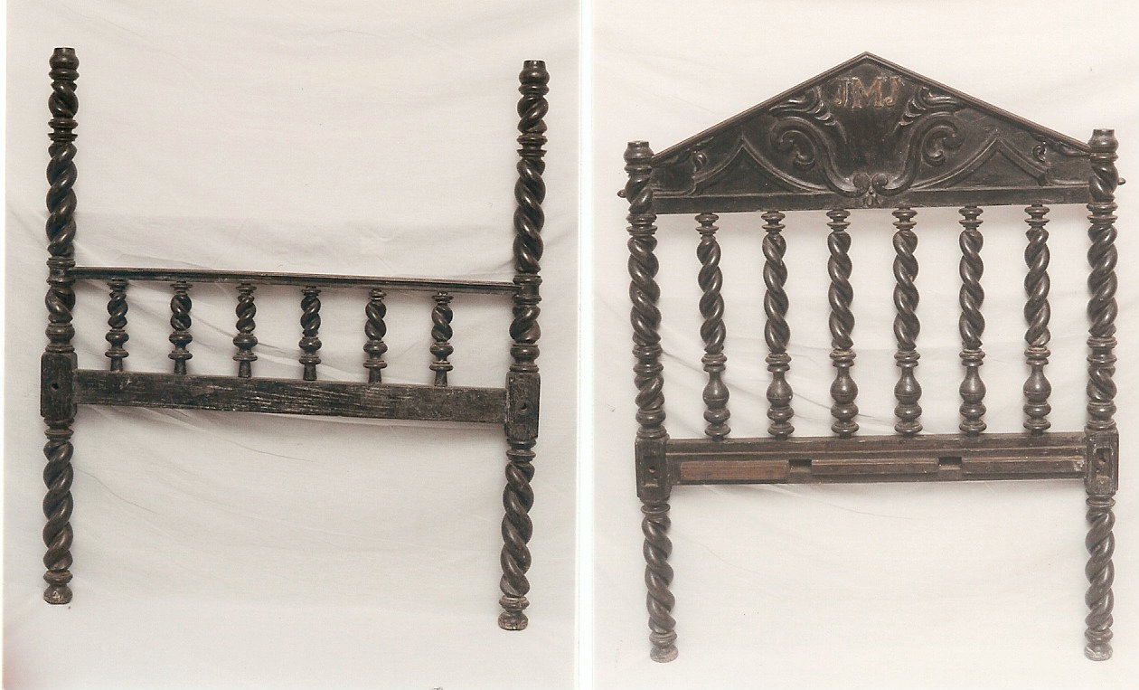 Leito [de casal] confeccionado em madeira escura (jacarandá), com parte superior da cabeceira terminada em frontão triangular frisado com a seguinte inscrição na parte central: "JMS". Apresenta quatro orifÃcios nas extremidades para encaixe das traves do dossel. Parte central da cabeceira com oito hastes verticais torneadas e torsadas com terminação seguindo a mesma padronagem decorativa, com oito hastes verticais (sendo duas mais compridas e as outra seis de altura menos elevada) sustentadas por duas hastes lisas dispostas horizontalmente. A peça encontra-se desmontada na Reserva Técnica (em março de 2005).