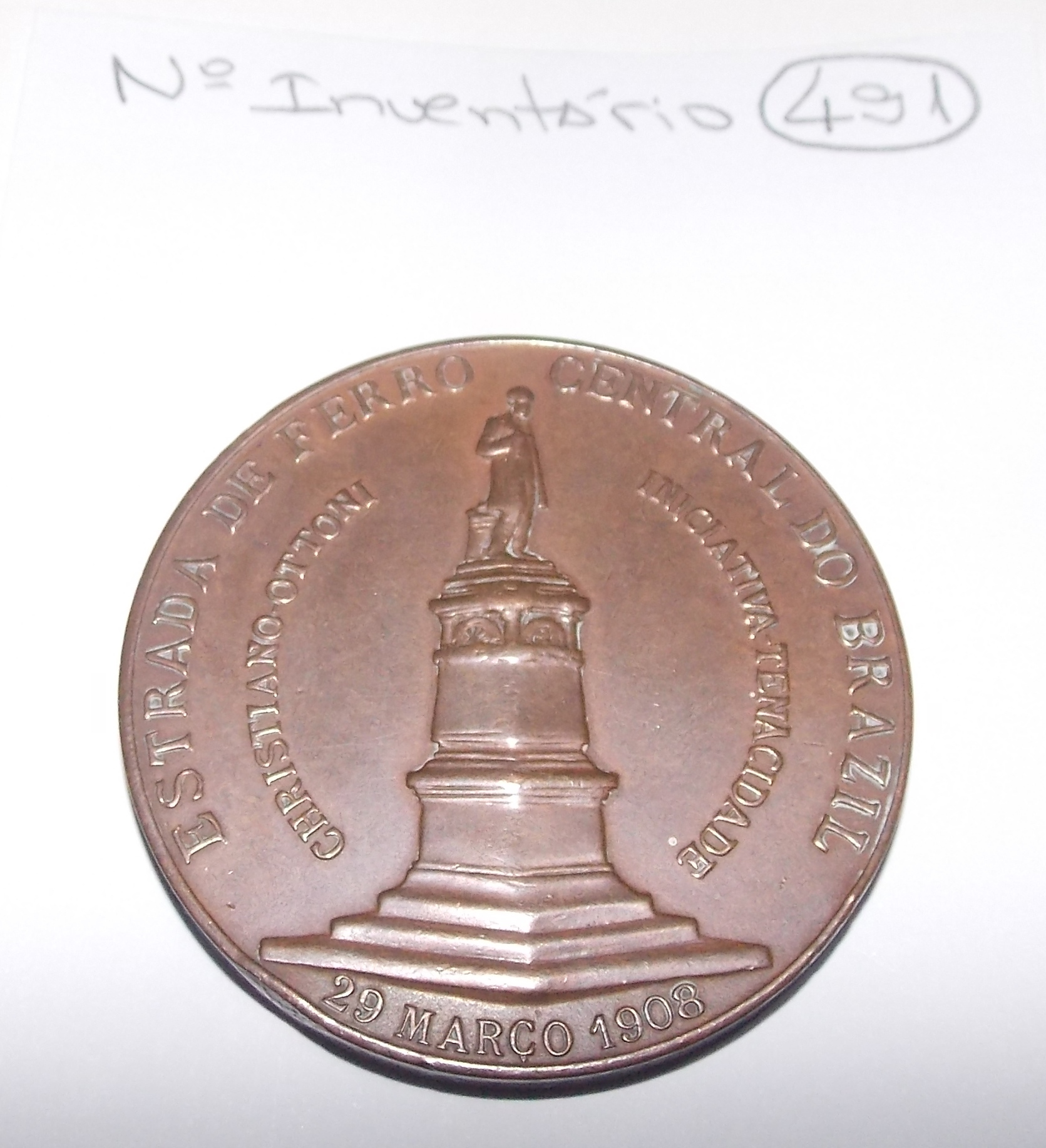 Verso: Representação de Christiano Ottoni em corpo inteiro, encimando um obelisco, apresentando na borda a seguinte inscrição “ESTRADA DE FERRO CENTRAL DO BRASIL / 29 MARÇO 1908”. Na parte interna da borda a inscrição: “CHRISTIANO OTTONI / INICIATIVA -TENACIDADE”.
