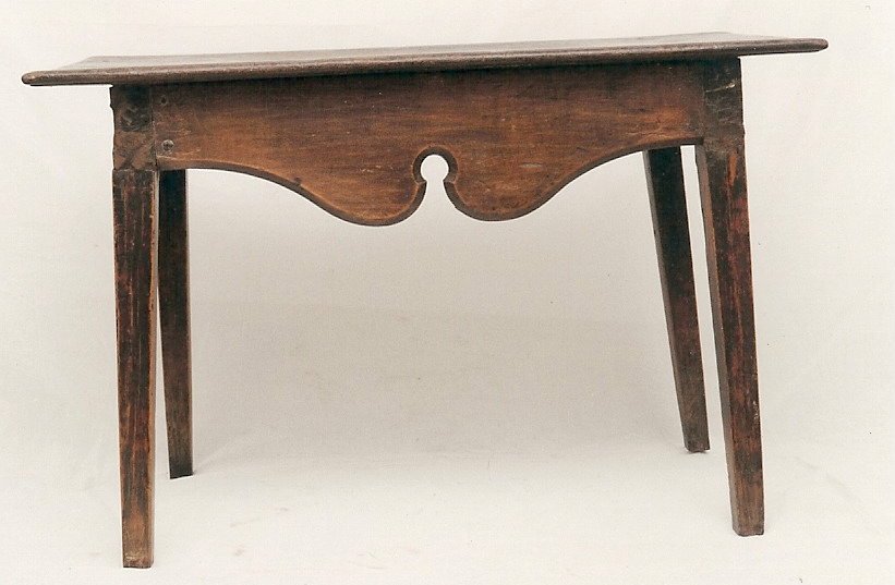 Mesa [de encostar], tÃpica da região de Minas Gerais, de manufatura rústica, confeccionada em madeira (cedro) entalhada e recortada. Apresenta tampo liso em balanço, saliente, com extremidades abauladas e quatro faces. Três faces lisas (laterais e posterior) e face frontal decorada com saia chanfrada e recorte em curvas arrematado por detalhe em cÃrculo na parte central. Pernas em cavalete, sem travessas.