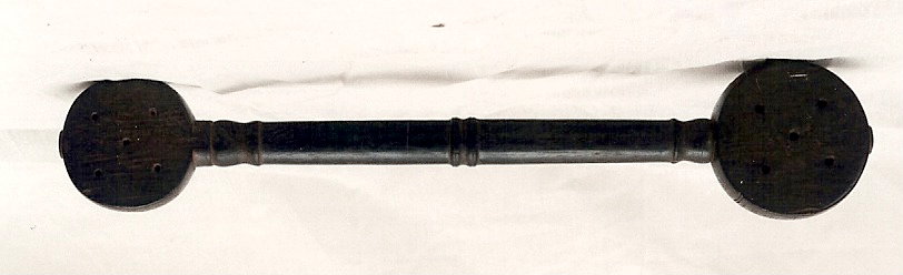Palmatória dupla, confeccionada em madeira (jacarandá) maciça. Extremidade superior composta por estrutura circular com cinco orifícios vazados. Extremidade inferior da peça contendo o mesmo formato circular, de diâmetro menor, e com cinco orifícios vazados, além de terminação em parafuso de madeira. Cabo torneado e com frisos.