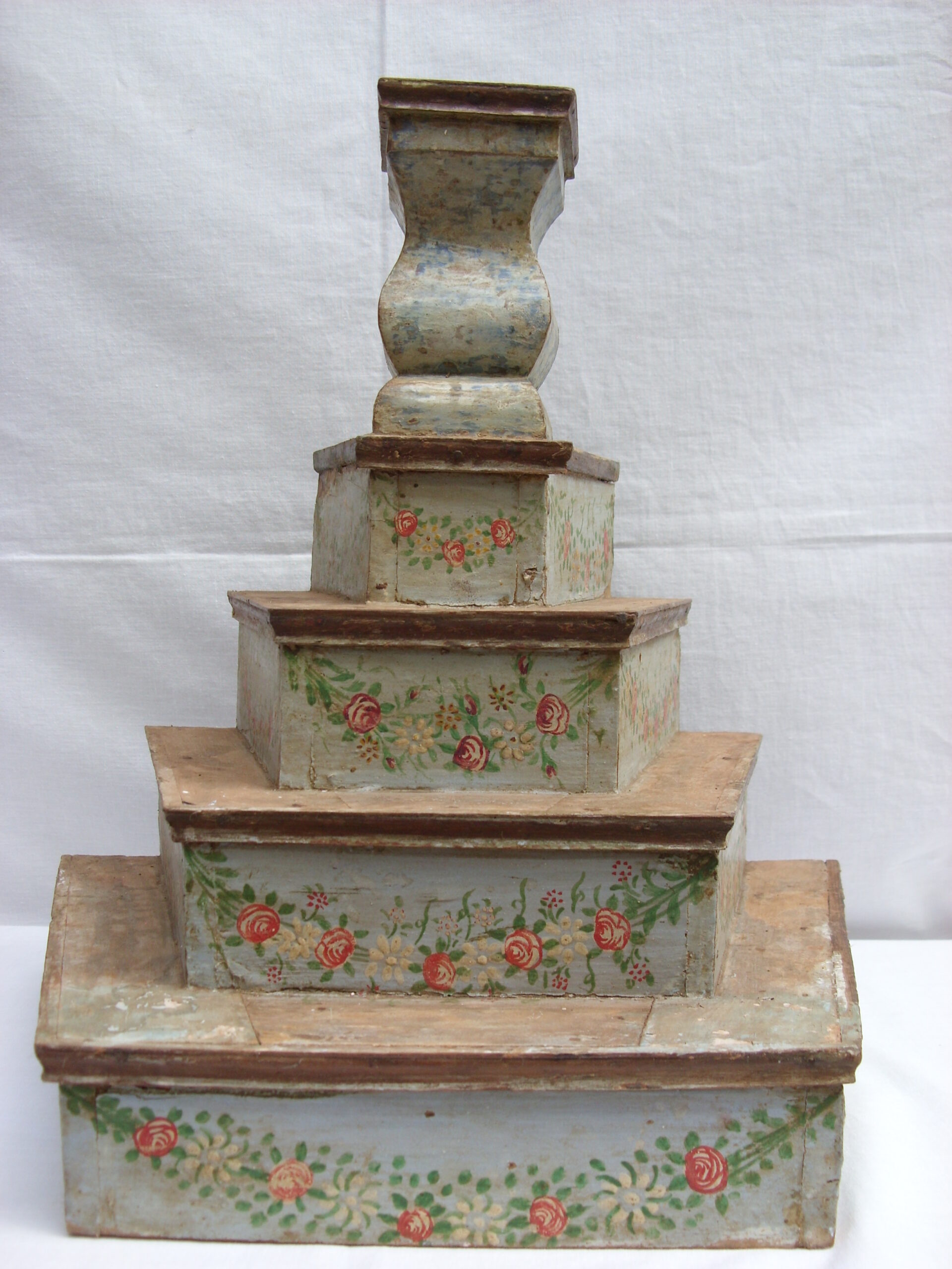 Penha escalonada, de formato piramidal, confeccionada em madeira (cedro) entalhada, recortada e policromada. Apresenta cinco nÃveis distintos de escalonamento, emoldurados e ornados, na parte frontal e laterais, por rosinhas de malabar, decoração tÃpica da região de Minas Gerais, nos tons vermelho, amarelo e branco, com ramagens em tom verde, sobre fundo azul claro. No escalonamento superior, coluna com base abaulada, parte central em curva e arremate retilÃneo para colocação de escultura religiosa. Parte posterior lisa.