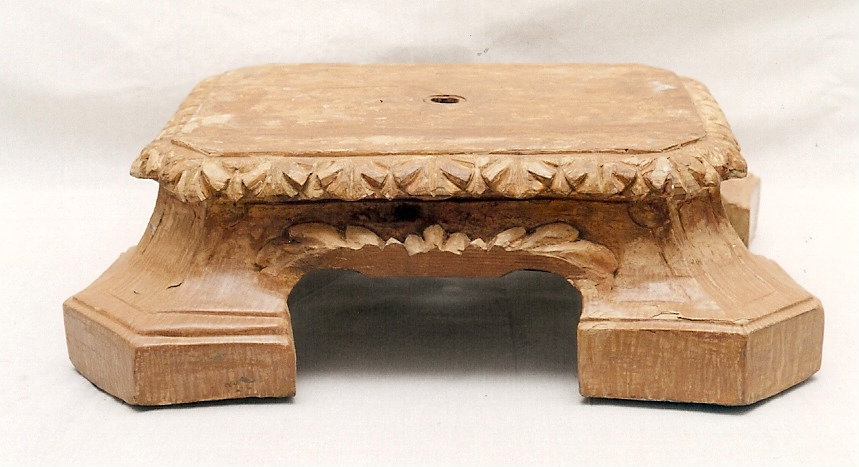Peanhaadministrador4 de junho de 2025Minas Gerais Documento 304_A-1-1-1-4 Baixar MetadadosTÃtuloPeanhaAutorNão identificadoNº anteriorNão encontradoDenominaçãoPeanhaMaterialfolha de ouro | madeiraTécnicadouramento | entalheOrigemMinas Geraisdata de produçãoSéc. XVIIIProcedênciaMinas GeraisClassificação05 Interiores > 05.1 Acessório de InterioresResumo descritivoPeanha confeccionada em madeira entalhada e dourada, com superfÃcie em formato octogonal, tendo orifÃcio central para encaixe da escultura, além de abas salientes ornadas com motivos fitomorfos estilizados. Objeto apoiado sobre quatro pés recortados com corpo abaulado e saias com entalhes em curvas e folhagens.Anexos