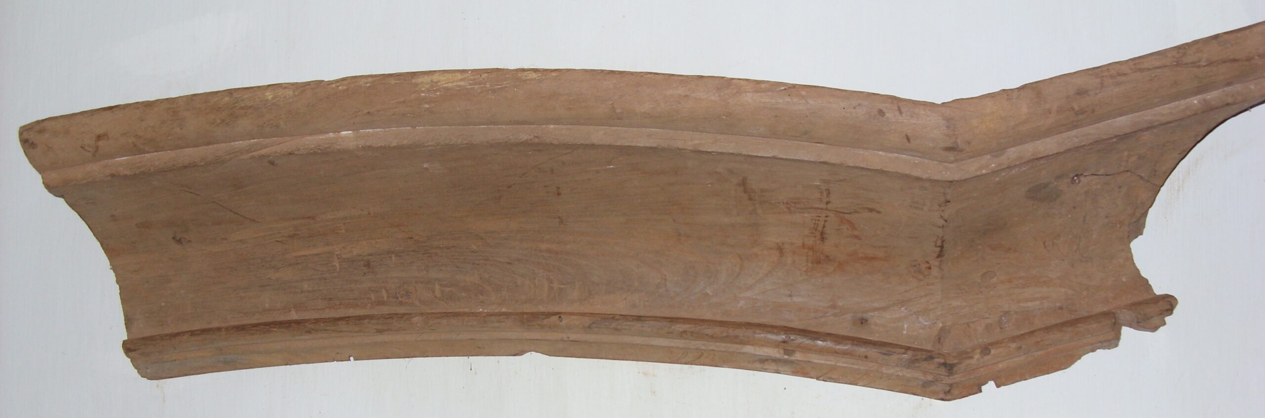 Peça de composição de retábulo, denominada ARCO. Objeto confeccionado em madeira (cedro) entalhada, composto por cimalha emoldurada e escalonada, com prolongamento em linha horizontal, que se adequa harmonicamente à estrutura da construção. Peça pertencente ao retábulo da antiga Igreja da Purificação (1720)".