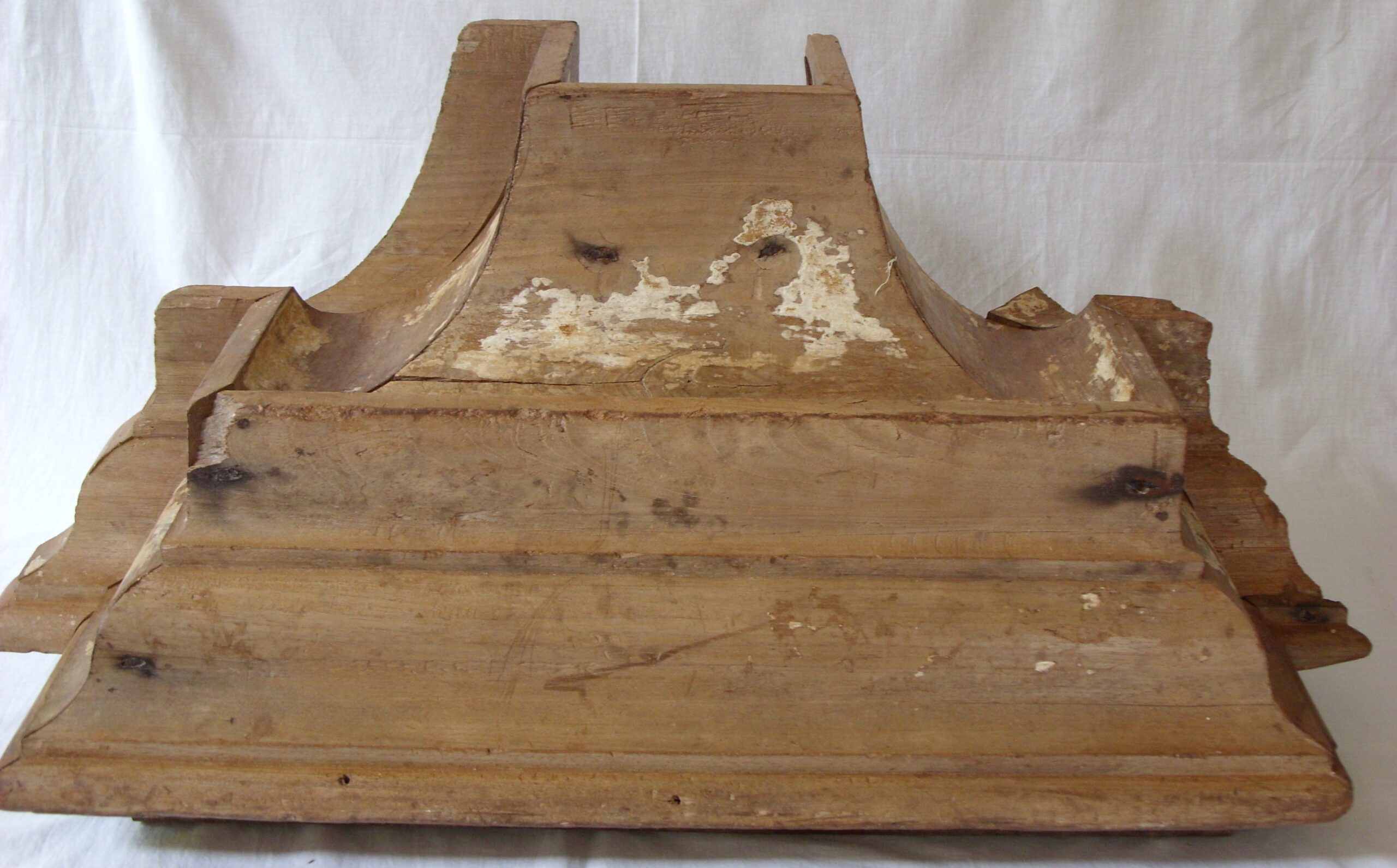 Peça de composição de retábulo, denominada ENTABLAMENTO. Objeto confeccionado em madeira (cedro) entalhada, composto por quatro partes, com cimalha retilínea e escalonada, que se adequa harmonicamente à estrutura da construção. Apresenta corte em diagonal à esquerda. Parte inferior mais delgada e de formato quadrangular para encaixe na parte superior da pilastra. Peça pertencente ao retábulo da antiga Igreja da Purificação (1720)".