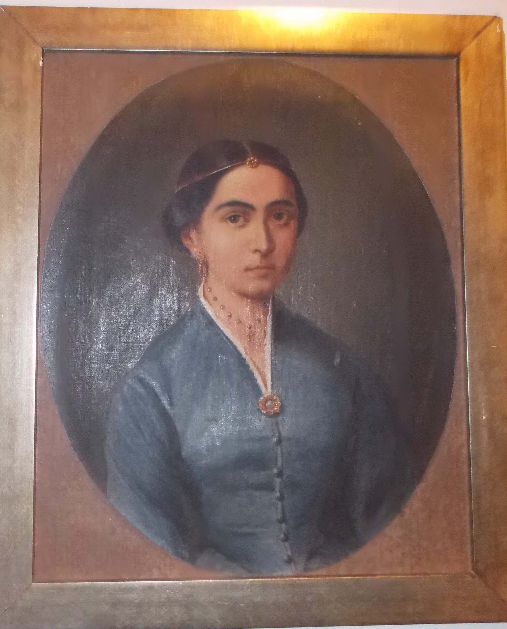 Executada em óleo sobre tela, apresenta figura feminista em meio corpo, posicionada diagonalmente à esquerda. Cabelos negros apresenta-se preso para trás. Veste-se com vestido acinturado em tom azulado, decote em V encimado por broche dourado em formato circular, abaixo botões perfilados verticalmente até altura da cintura.