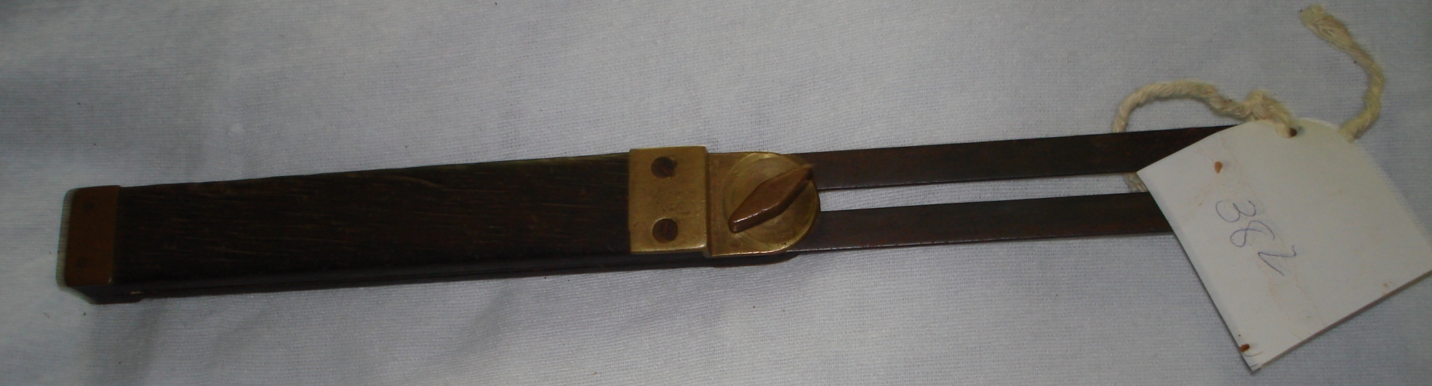 Instrumento de precisão, denominado SUTA. Objeto confeccionado em madeira escura e metal dourado (latão). Apresenta cabo de estrutura retangular com extremidades em metal fixados por dois pregos. Uma das extremidades é arrematada por estrutura abaulada com pino (em formato de losango) que permite a fixação e o movimento rotatório da parte complementar do objeto. Complemento do objeto em ferro, formando uma espécie de "régua", com extremidades abauladas, tendo parte central vazada.